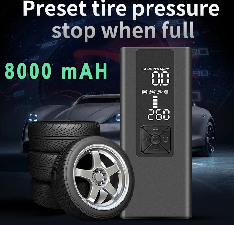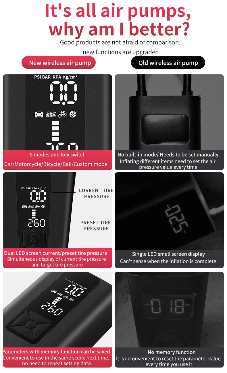 Wireless & Portable: The wireless design and compact mini size make the air compressor portable and easy to operate with one hand. The compressor is ready in only 4 steps. An LCD display indicates the air pressure.