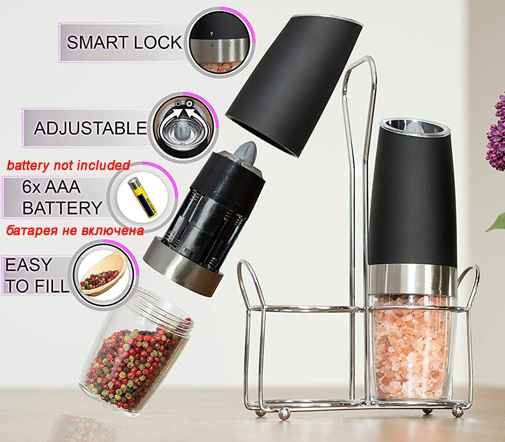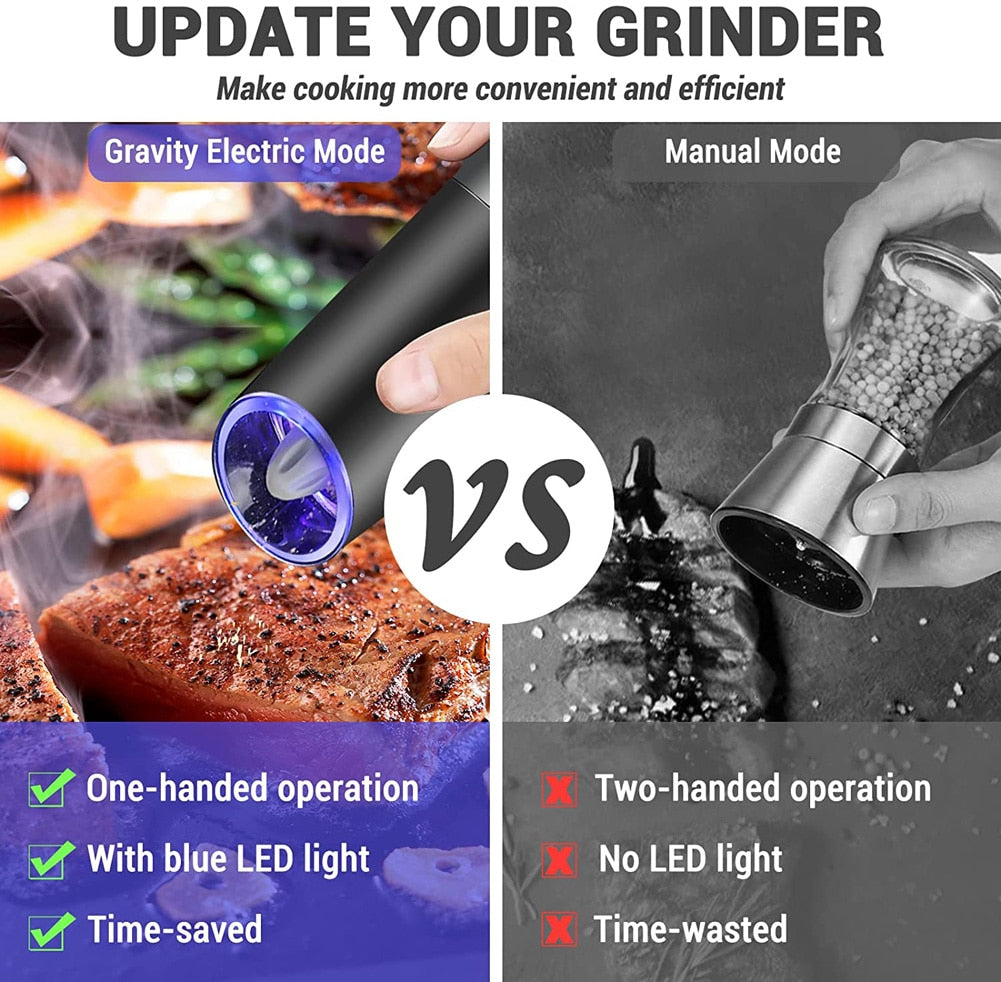 Great if you are tired of cranking fresh pepper. KitchenBoss gravity sensing salt pepper grinders, only needs one hand hold and tilted at 45° for automatic season evenly. Awesome gift for friends and family.